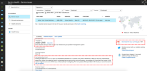 • Get the most recent update to understand what Azure is doing to resolve the issue. Get a link for the issue to use in your problem management system. Also, download a PDF summary of the issue to share with people who don’t have access to the Azure portal.